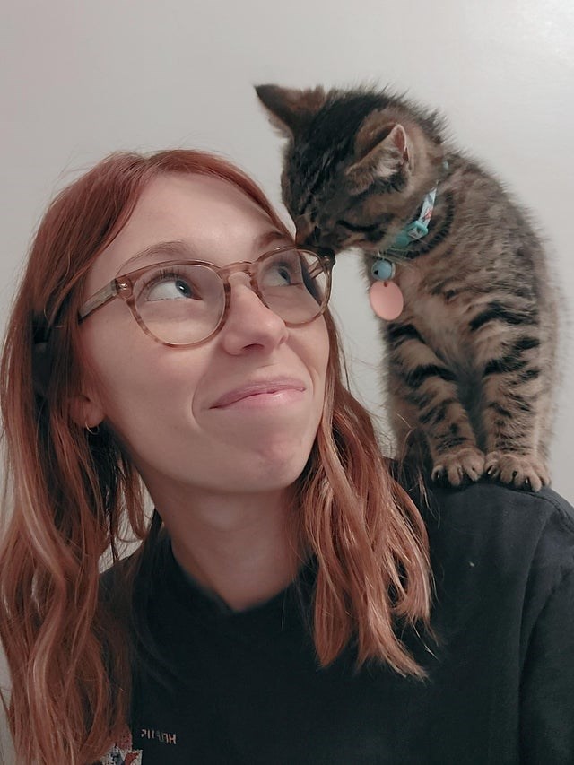 Uhh... the shoulder cat days. Savor these moments, cat mom, you will miss them later. The days of my cats being small enough to sit on my shoulder were so special, and I'm so glad to have taken pictures. And if you're one of the lucky ones that has their cat sit on their shoulder when they're older as well, just know that we are very jealous of you lol.