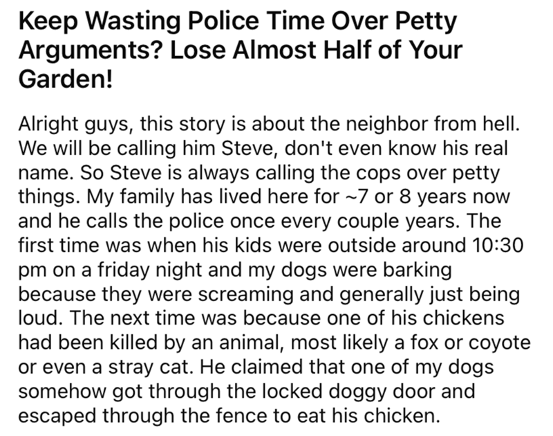 Unfortunately, there are far too many of us that have ended up living next to a neighbor who has seemingly completely lost their grasp on how to act like a reasonable, vaguely sane and bearable human being. Some people end up drifting quite far out there, and the last thing you want to find yourself reckoning with, is having to live next to them. Fortunately, this tale of pro revenge has a happy ending for some folks involved, and it sounds like Steve got the wakeup call he so sorely needed. For some more lovely drama between neighbors check out this HOA member who got their neighbor's car towed, and then how the neighbor returned the favor.