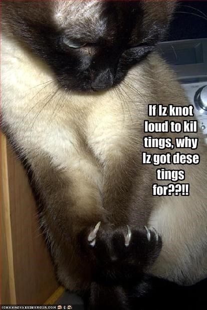 If Iz knot loud to kil tings, why Iz got dese tings for??!!
