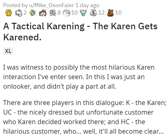 It's not uncommon for an irate Karen to find a fellow customer and assume they're an employee based on the color of their shirt. In typical hyper-aggressive Karen fashion, any attempt to let the Karen know that she is mistaken will be met with a "you're just a lazy employee who just doesn't want to help me." Cue this bystander who figure out a way to beat Karen at her own stupid game. Customer service is a wild game.