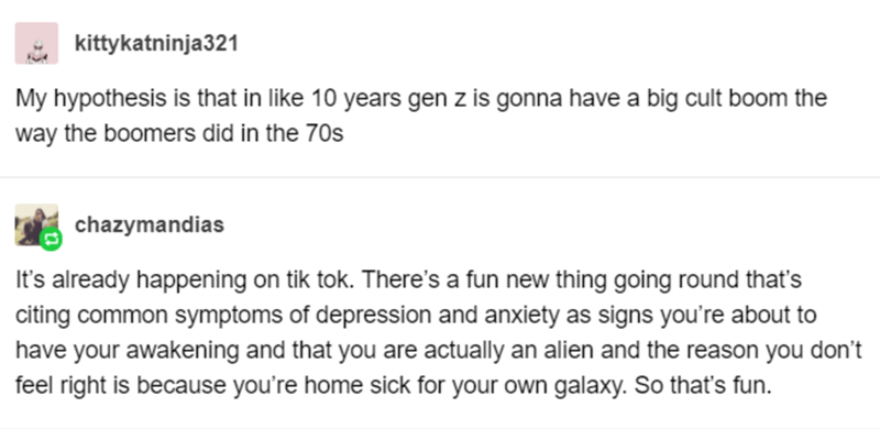 These are strange times. The world continues to change at what seems to be a faster and faster pace. Life as we know it could look like something right out of an infamous sci-fi movie in the near future. But also, apparently this is a time ripe for the rise of cults. Just a little bit unsettling. If you're looking for some more gold from Tumblr, check out these random, funny, and resplendent Tumblr gems.