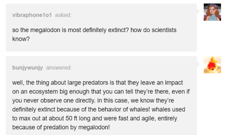 Just in case you weren't already aware, Megalodons are an extinct species of shark that ranged between 15 and 18 metres. Basically, those underwater tanks were so massive and generally physically formidable that they'd have wreaked such havoc on blue whales that we'd end up seeing their population die off/get physically smaller for survival. Obviously, blue whales are huge. So, just the thought of that is a tad bit unsettling. Outside of what the Megalodons would do the ocean's modern day ecosystem, there does seem to be a lot of room for a creative take on some kind of Megalodon-inspired horror film. Hence, this Tumblr thread.