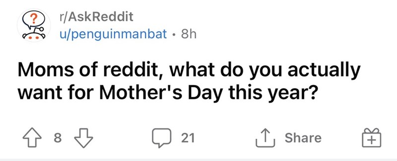 It was Reddit user u/peguinmanbat who asked the mothers of Reddit to share what they actually wanted for mother's day this year. It seems it might be a harder question than you might think because only a few moms shared their true desires.