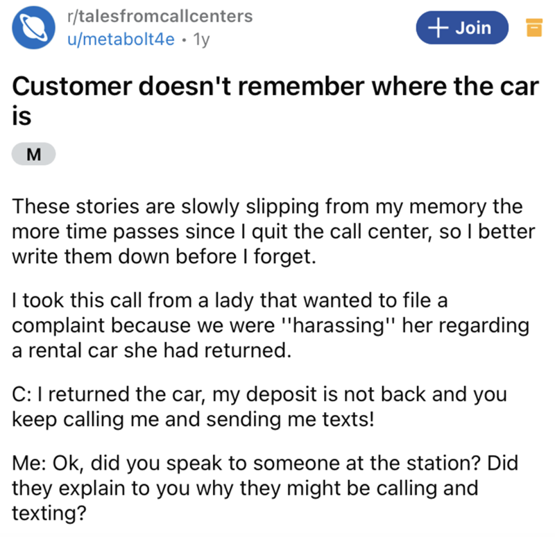 It sounds like there was a whole lot more going on in this lady's life. It was confirmed in the comments section that the hospital parking lot she ended up parking the rental car at was pretty dang far away from where she was supposed to return the rental car. Seems like she could've just parked close to where she lived, and then when that turned out to be a faulty move, she tried to play dumb. The thing about playing dumb in her case was it only made the fees worse.