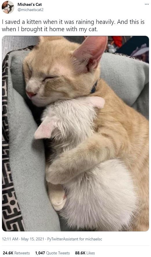 Cat - Michael's Cat @michaelscat2 I saved a kitten when it was raining heavily. And this is when I brought it home with my cat. 12:11 AM May 15, 2021 - PyTwitterAssistant for michaelsc 24.6K Retweets 1,047 Quote Tweets 88.6K Likes