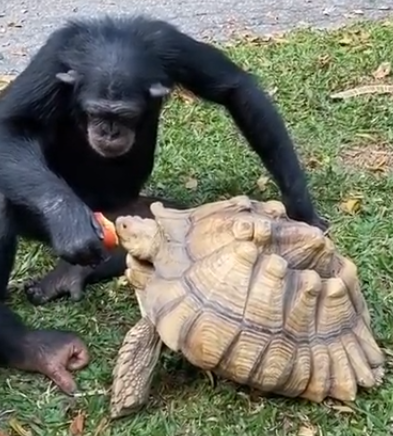Just a two friends helping each other out. Mr. Gorilla here is very gently feeding his large turtle friend who appears to need an extra helping hand. Now that is what friendship is all about, helping and supporting one another!