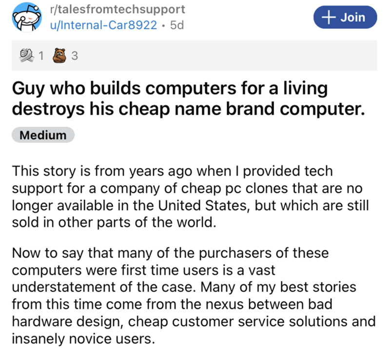 If there's one major takeaway from this tech support tale it's that just because you can build a PC doesn't necessarily mean that you know how the computer works. One can only begin to imagine the amount of hot flashes of embarrassment that this dude must've been bogged down by after realizing that he'd literally engineered the downfall of his cheap brand name computer. Like, he literally just created destruction where there otherwise would've been none to have been had. Oh well. You live and you learn. For another ridiculous tech support tale, check out this CEO who thought his computer had been hacked, and then proceeded to learn how a computer works.
