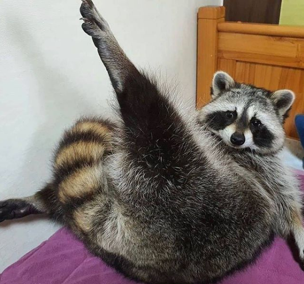 Mmmm hmmm. Just working on my morning stretches. It's super important to stay fit and limber! You never know how tall the trash bin I'm going to break into today will be. This raccoon is prepared for anything.