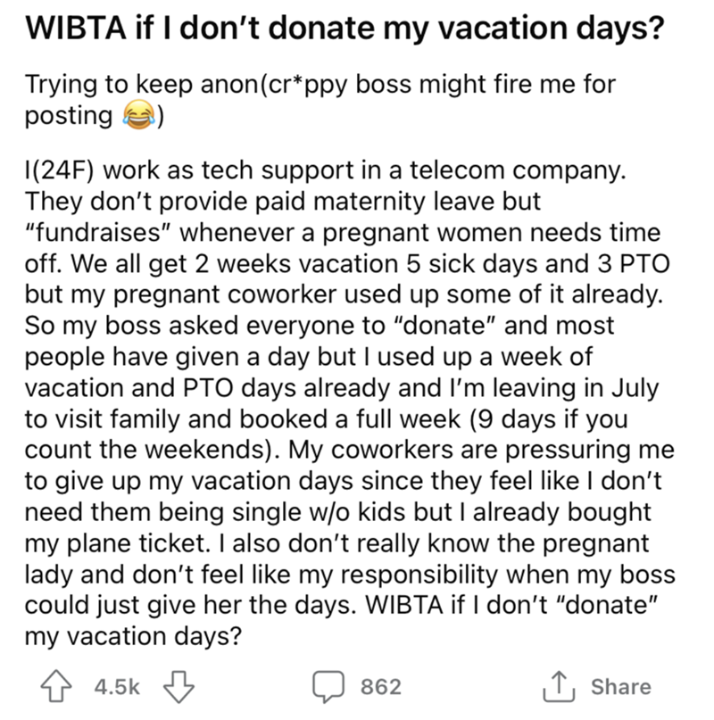 Woman Won't Donate Vacation Days To Coworker, Asks If She's Wrong