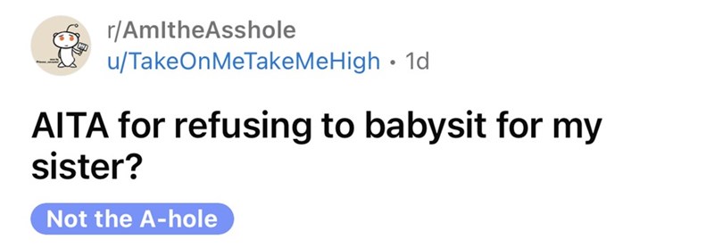 It was Reddit user u/TakeOnMeTakeMeHigh who asked the 'Am I The A-Hole' community if they were in the wrong for saying no to babysitting for her sister. It's important that even our family members understand that 'No' is a full answer.