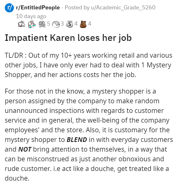 Working retail comes with a very special set of gripes unlike any other job. The entitled customers, utter Karens and bored scamming shoppers leave retail employees with a hollow dissatisfaction that makes one wonder if there are any sane people left on the planet. Secret or mystery shoppers are one of those interesting speed bumps that you wouldn't think would be infiltrated by the forces of Karenhood, but lo and behold, here we are.