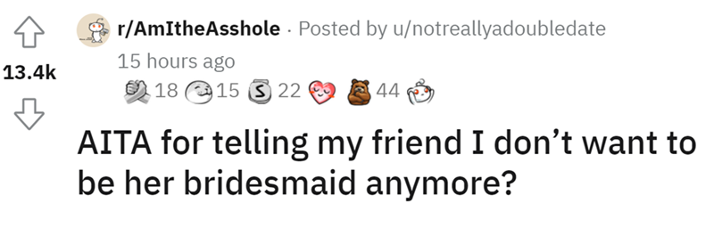 It was Reddit user u/notreallyadoubledate who asked the 'Am I The A-Hole' community if she was the one in the wrong when she told her friend that she had no interest in being her bridesmaid anymore.