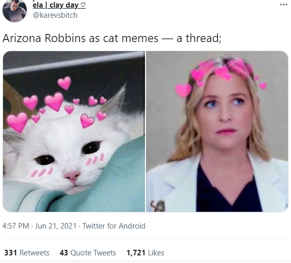 Photograph - ela clay day O ... @karevsbitch Arizona Robbins as cat memes – a thread; 4:57 PM · Jun 21, 2021 - Twitter for Android 331 Retweets 43 Quote Tweets 1,721 Likes