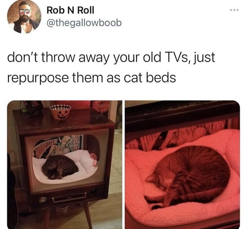 What!! Okay, mind blown. Who knew that this could even be done! A refurbished tv cat bed is the most purrfect bed time treat for your feline friends. Look how cozy this lil guy looks in his tv bed, comfy and cozy.