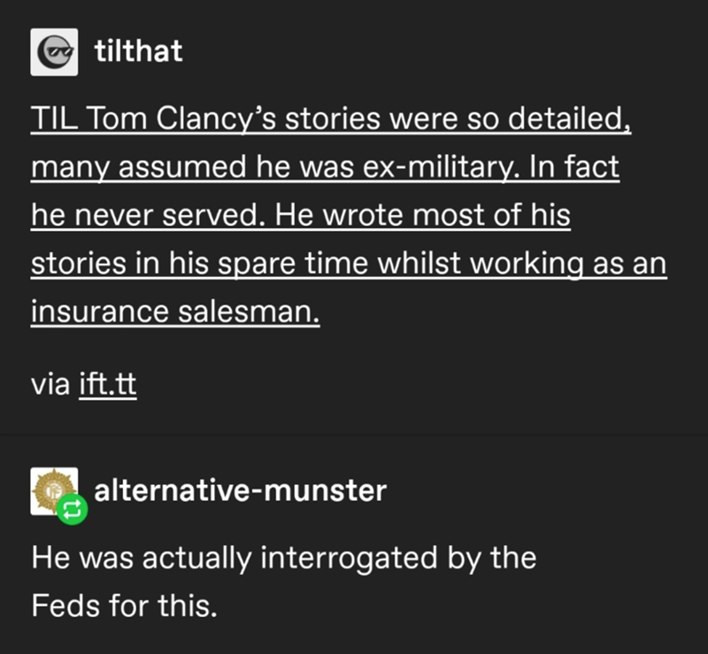 It's pretty wild to imagine yourself in a scenario where you're literally being interrogated by the authorities because of a purely fictional spy story that you wrote that just so happened to come way too close to a real life spy situation. How were you supposed to know that making highly educated guesses about ships could be a threat to national security? Honestly it's kind of on the government for making a tool of war that's so easy to just make up in your head. Maybe Tom Clancy should have gone the other way with it, made it really obviously fictional and wrote garbage like "and then General Supercommander Smith climbed through the colorful ball pit, took the slide down to maintenance, and then took one of those single-chair wall-mounted-escalators-they-make-for-old-people up to the president of the boat's office." That would have gotten everyone off his back.