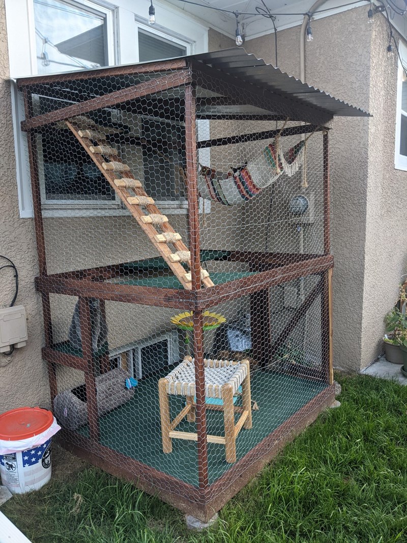"4'x6'x7' catio with corrugated steel roof and chicken wire. Estimated cost probably came out to around $150-$200."