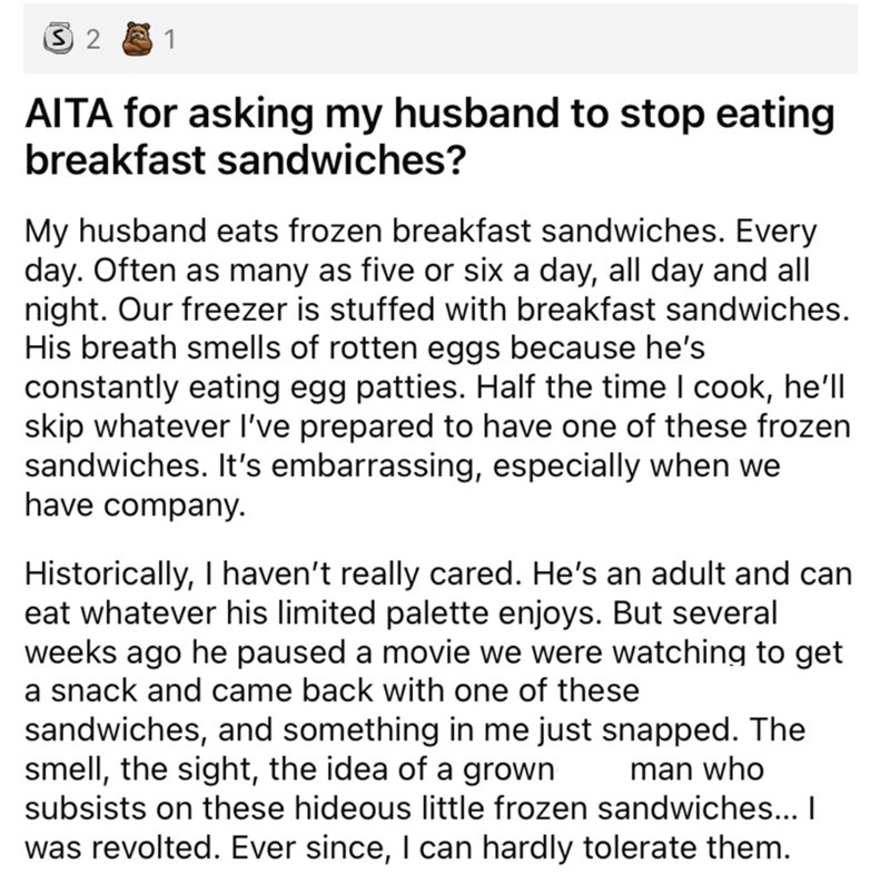Wife Condemns Husband Over His Love For Breakfast Sandwiches