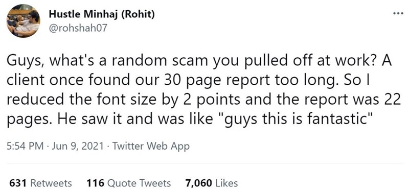 Font - Hustle Minhaj (Rohit) ... @rohshah07 Guys, what's a random scam you pulled off at work? A client once found our 30 page report too long. So I reduced the font size by 2 points and the report was 22 pages. He saw it and was like "guys this is fantastic" 5:54 PM · Jun 9, 2021 · Twitter Web App 631 Retweets 116 Quote Tweets 7,060 Likes