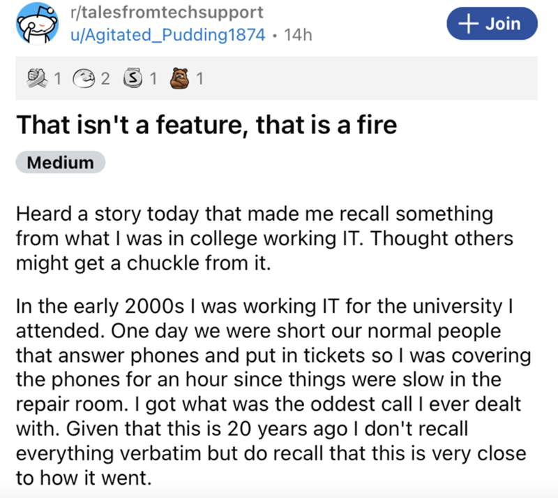 What in the world would people do without IT? Seriously. Just take the guy that we have in this humorous tech support tale. For whatever reason he was leading a life where he assumed that flames erupting from his computer were a totally normal and acceptable function of the device. Well, it sounds like even after the IT dude showed up to smooth over the issue, the guy still left the interaction puzzled by why there wasn't a "stop the smoke" button. For another tech support tale check out the time that a man assumed his computer would work during a power outage.