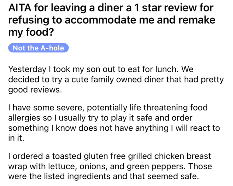 Customer Has Severe Food Allergies, Restaurant Fails To Be Accommodating, Customer Leaves 1-Star Review