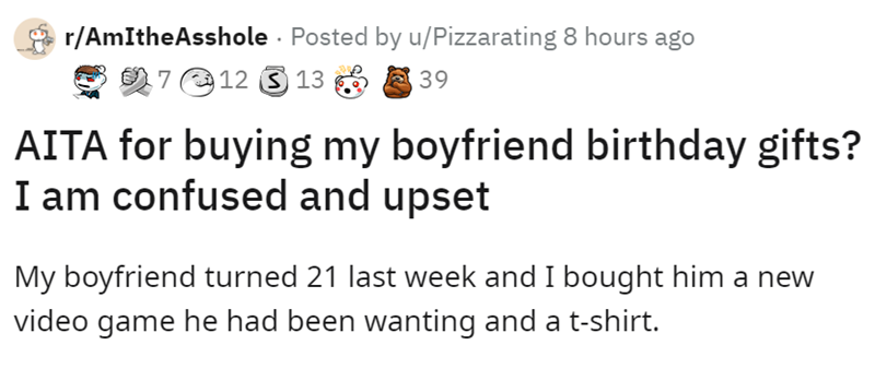 Relationships are messy and complicated, but we hope we can expect logic from our significant other, at the very least. In today's "Am I The A$$hole?" thread, OP is confused that her boyfriend is upset at her after she bought him birthday presents. He claims that she only bought him gifts so that he would repay the favor on her birthday. We hoped he would have wanted to buy her a gift as her boyfriend, but clearly, we thought wrong. Redditors think there must be an underlying personal issue for the boyfriend that we're unaware of, but what do guys think of this weird situation? Let us know in the comments.