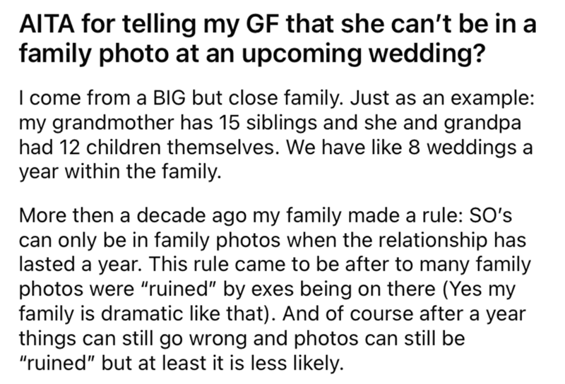 Man Doesn't Let Girlfriend Be In Family Photos At Wedding, Asks If He's In The Wrong
