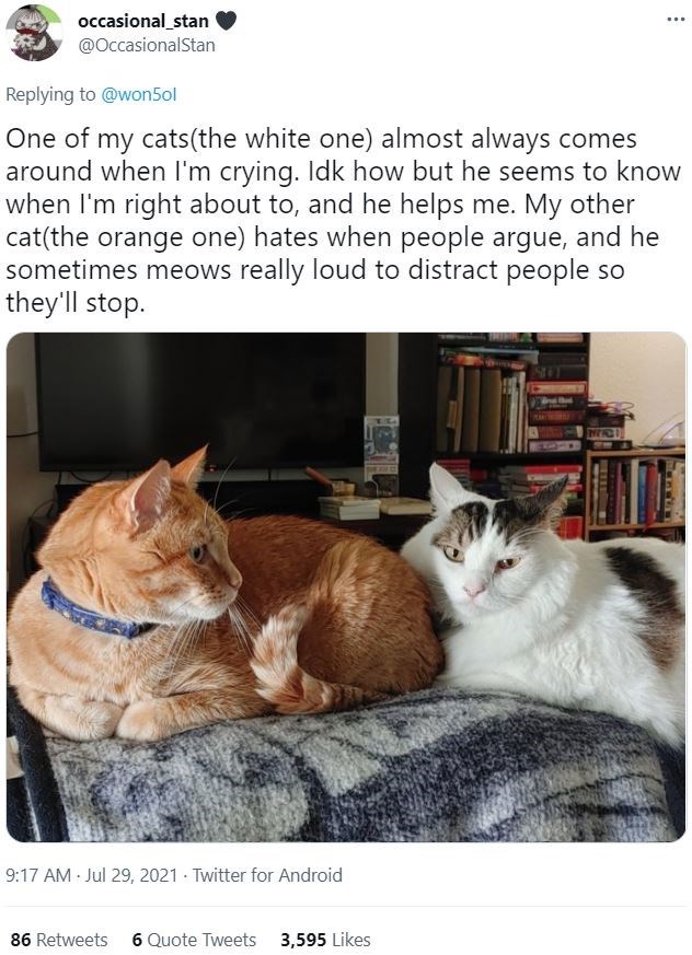 Cat - occasional_stan @OccasionalStan ... Replying to @won5ol One of my cats(the white one) almost always comes around when I'm crying. Idk how but he seems to know when I'm right about to, and he helps me. My other cat(the orange one) hates when people argue, and he sometimes meows really loud to distract people so they'll stop. 9:17 AM Jul 29, 2021 · Twitter for Android 86 Retweets 6 Quote Tweets 3,595 Likes