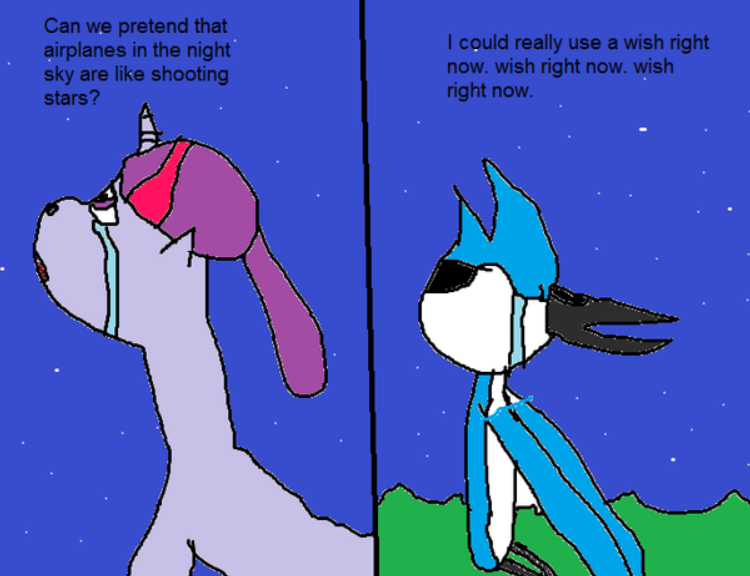 In 2012, DeviantArt user bluedog444 shared an illustration depicting My Little Pony's Twilight Sparkle and Regular Show protagonist Mordecai both separately looking up at the night sky while cry-singing the lyrics to 'Airplanes' by B.o.B. Thus, MorteTwi was born.