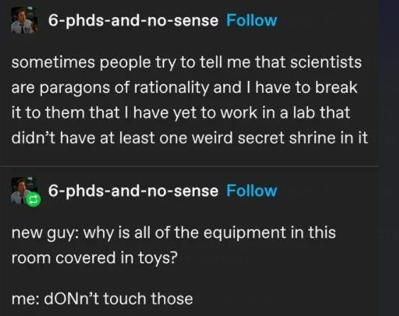 We're all superstitious people to some extent. One would assume that scientist and lab techs, whose jobs depend on objectivity and scientific rigor, would be the most rational at work. But nah, everyone's got their good luck charms. Be they Taiwanese snack foods or happy meal toys, these are the things that keep the machines running, sort of. For some more fun science junk, here's the sciences judged on lickability and a tumblr thread on why frogs have got weird bones.