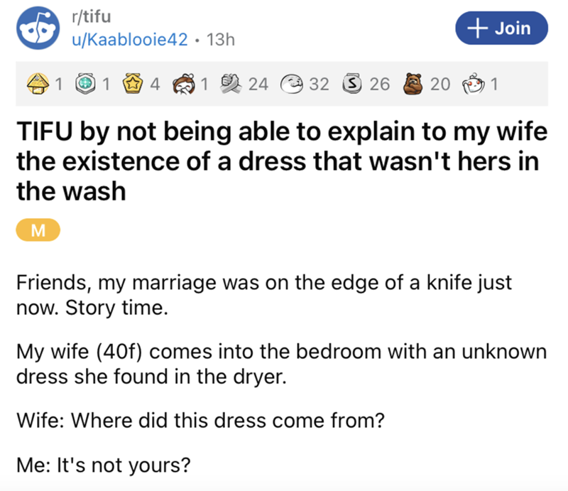 There are plenty of folks out there who have ended up confronting the unfortunate reality that is realizing the washer/dryer has miraculously deposited a complete stranger's clothing in your pile of freshly cleaned clothes. Things can get especially dicey when you're married. It sounds like this guy narrowly dodged a full-fledged meltdown from his very concerned wife.