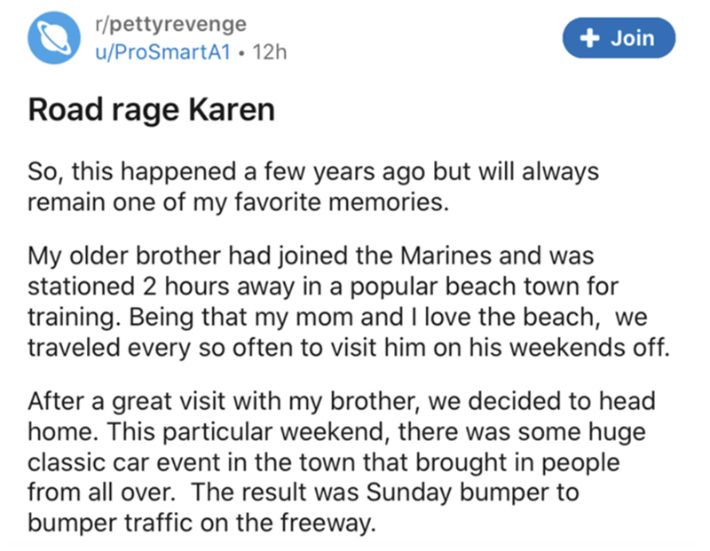 Unfortunately, our roads are regularly occupied by wild individuals who insist on staging full-on temper tantrums. If you drive a car, you've almost definitely seen road rage in action — perhaps you've even engaged in it yourself on a bad day. People get angry while driving; it is, after all, a fairly high-risk endeavor. Redditor u/ProSmartA1 took to r/PettyRevenge to detail one particular road rage incident they were part of and how they reacted to it. When a Karen in the car behind them started laying on the horn and calling for the original poster to move their car up in the middle of a traffic jam, the OP and their mom decided to have a little fun with the car behind them's rage. They made a point of letting a significant number of cars pull ahead of them, slowing down the angry driver even more. We know it happens, but when you get irrationally mad on the road, sometimes people are going to spite you just to give themselves some entertainment in traffic.