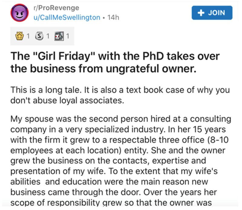 This thread was posted to Reddit's popular r/ProRevenge subreddit by the spouse of the employee in the story, u/CallMeSwellington. They shared this story to the sub with the title "The 'Girl Friday' with the PhD takes over the business from ungrateful owner."