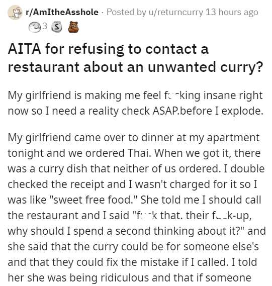 Girlfriend Pushes Moral Prerogative Of Calling Restaurant Over Extra Curry, Guy Flips Out