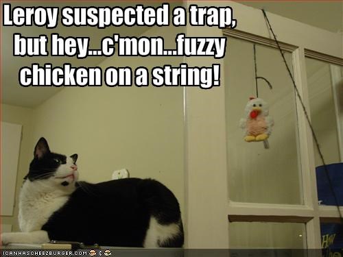 Leroy suspected a trap, but hey...c'mon...fuzzy chicken on a string!