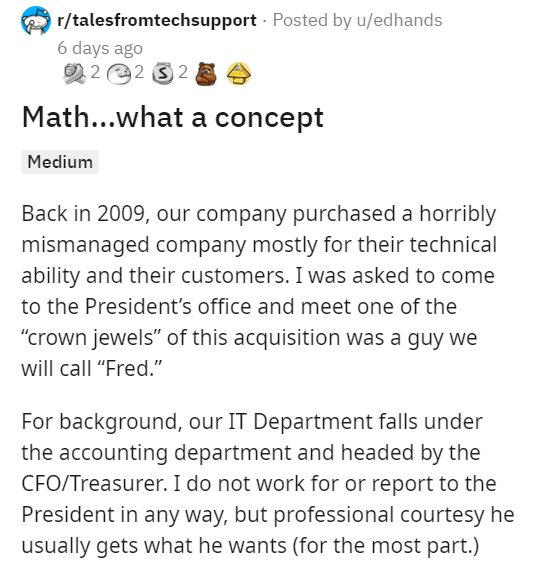 People in IT get some tall orders, especially when they're trying to help the kind of people who think that smoke is a feature of their device. Not only do they have to contend with people who have no idea what they're doing, but occasionally they also have to deal with other IT professionals who also don't know what they're doing. That's the kind of situation Redditor u/edhands posted to r/TalesFromTechSupport, detailing a bizarre scenario in which they were introduced to a new IT colleague named "Fred" after a company acquisition. "Fred," management decided, needed specific configurations for his computer — but the specifics he asked for genuinely weren't possible. When our original poster noted that the specs involved couldn't work together, he was dismissed by management and did the only thing he could — set it up the way it was asked of him and have to re-explain that the computer wouldn't work with "Fred"'s demands later in the week when the computer didn't work properly.