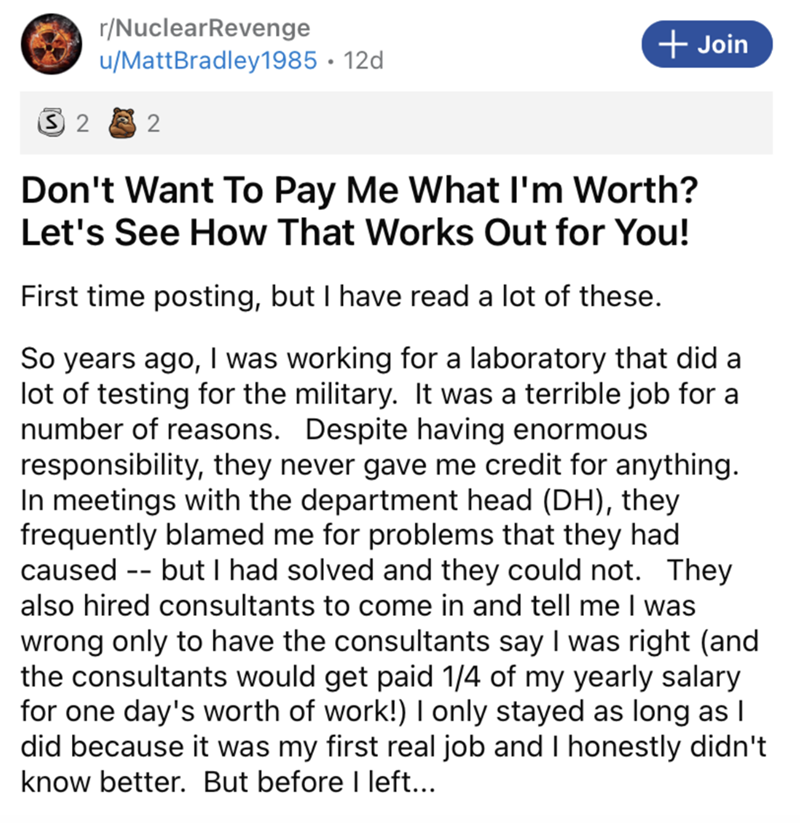 It's no wonder this guy unleashed the brutal revenge that he did. Pretty much anyone that comes to learn that they're being knowingly taken advantage of by their company is going to be inspired to take their vengeance. In this case, it sounds like the company's decision to take the shady, cheap route on a top-performing employee couldn't have had any more painful blowback than it did. Seriously, a mere $20K to that employee could've resulted in a reality where they didn't end up losing a couple million dollars. To keep the revenge drama train rolling check out this recent revenge story about a rude lawyer who parked in a farmer's driveway, so the farmer plotted a stinky revenge.
