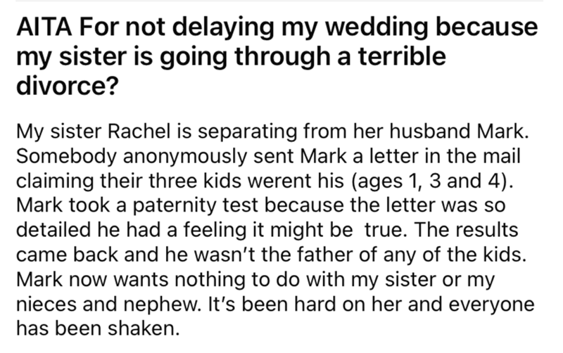 Bride's Sister Ends Up In Divorce, Refuses To Delay Wedding, Sister Pitches Fit
