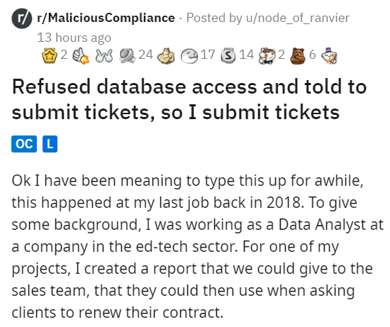 This story about silly IT bureaucracy at a tech company is a fairly innocent tale; nobody gets fired or publicly shamed in the end, but it is a perfect example of a mildly disgruntled employee exposing an unnecessarily involved workflow process. When Reddit user u/node_of_ranvier was tasked with pulling thousands of data points from a database the IT department denied them access to, they did the only thing they really could: bombard the IT department with requests for this data until they understood it made significantly more sense to give one person access for a specific project rather than drag the entire IT department down with extra work. Do not mistake this for a tale of personal revenge, — it's just one guy making sure to highlight a particular process at work that did not make sense.