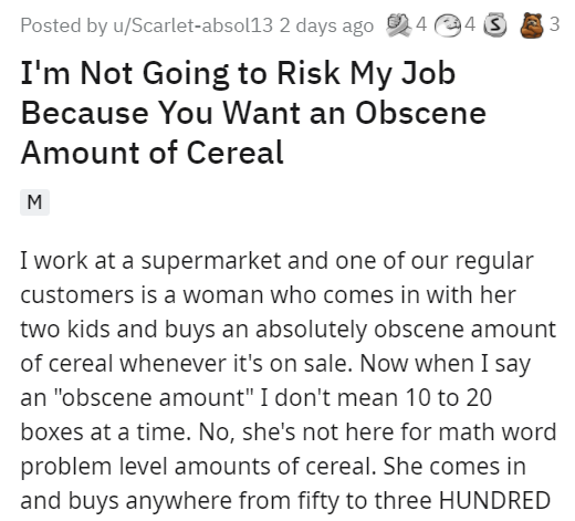 There are people who buy in bulk at the supermarket, and then there is the woman from this post on r/entitledparents, who shows up to a supermarket every so often to buy apparently anywhere between fifty to 300 boxes of cereal at a time. Aside from the basic absurdity of this — people in the comments speculated that she is flipping cereal for local bodegas — the parent in question apparently refuses to let the supermarket know ahead of time when she will be coming to purchase as much cereal as possible, leaving the original poster and his coworkers scrambling to fulfill an insane order more than once. When this OP found themselves in direct interaction with the woman in this exact scenario, the unhelpful shopper finally got a dose of her own medicine, getting turned away because she didn't do as they ask and call days in advance so the store could be prepared to fulfill her order.
