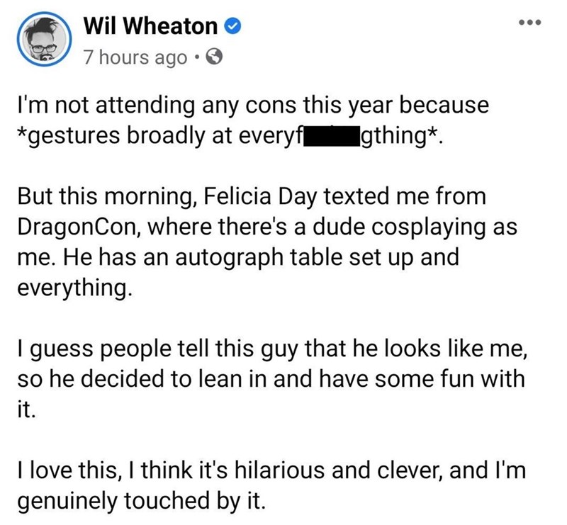 Everyone has their moment to shine, and if you look vaguely like Wil Wheaton then this might have been yours. Wil posted yesterday on his Facebook to share that a fan has been cosplaying him at cons this year, as the man himself has not been attending any. This hilarious scoundrel has been going with a full booth setup (complete with fake "discounted" signing fees and full display posters) and taking 'signings' as Wil.
