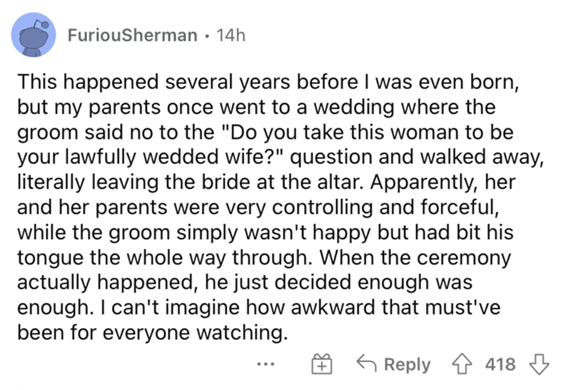 It seems like we regularly come across wildly unnecessary and dramatic scenarios that break out at otherwise peaceful weddings. There's just something about bringing together certain family members that almost always seems to manifest in some kind of drama or another. You just hope that it's not an unfortunate sequence of events involving a bridezilla acting out in all kinds of toxic ways. Instead, maybe something like a couple folks getting over served at the proverbial open bar at a wedding. Or, maybe the DJ throws on an unforgettably terrible song that nobody in their right minds would've wanted to hear. To keep the wedding drama going, check out this post about a woman who refused to cut her hair after her dad demanded that she get the haircut for his wedding.