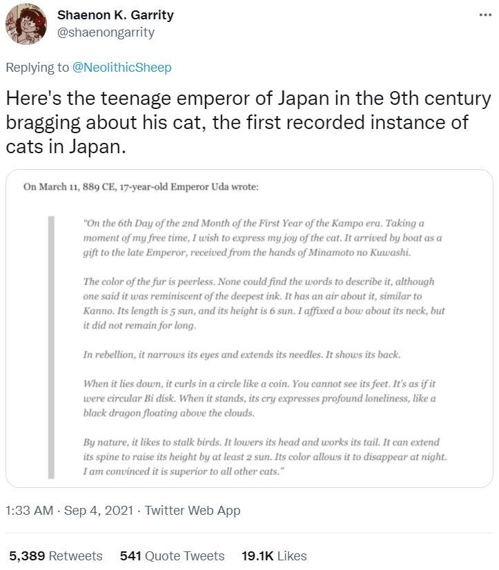 And it's really just the icing on the cake that he is talking about a black cat here. "Its color allows it to disappear at night," might be one of our favorite sentences from this entry, though there are many contenders. Yes, teenage emperor, you give our black voids the love that they deserve.