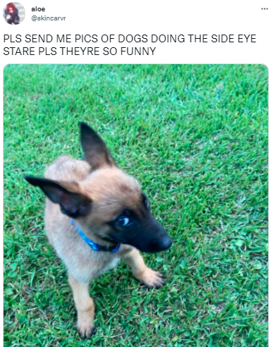 PLSSSS. Wherever you are, whatever you are doing, drop it and send this guy some dogs doing the side eye pics. We are 100% with aloe here, this is a hilarious image. More dogs doing the side eye images, plz.
