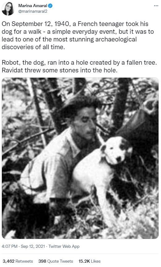 Dog - Marina Amaral ... @marinamaral2 On September 12, 1940, a French teenager took his dog for a walk - a simple everyday event, but it was to lead to one of the most stunning archaeological discoveries of all time. Robot, the dog, ran into a hole created by a fallen tree. Ravidat threw some stones into the hole. 4:07 PM - Sep 12, 2021 - Twitter Web App 3,462 Retweets 398 Quote Tweets 15.2K Likes