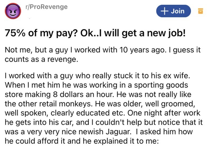 There's no getting around the fact that people are prone toward fits of psychotic spitefulness when their marriages fall apart. Love drives people to crazy lengths, and a love gone sour is bound to do the same thing. It sounds like this mad lad kept his wits about him as things unravelled. That goes without saying the level of spitefulness is almost terrifying. Yet, at the same time it sounds like he proceeded to walk through life in a respectable enough fashion, and made the most out of taking just a little bit of a pay cut. Pack some more revenge drama on your plate with this story about a neighbor who brought furious wrath upon themselves by repeatedly parking in a woman's driveway.