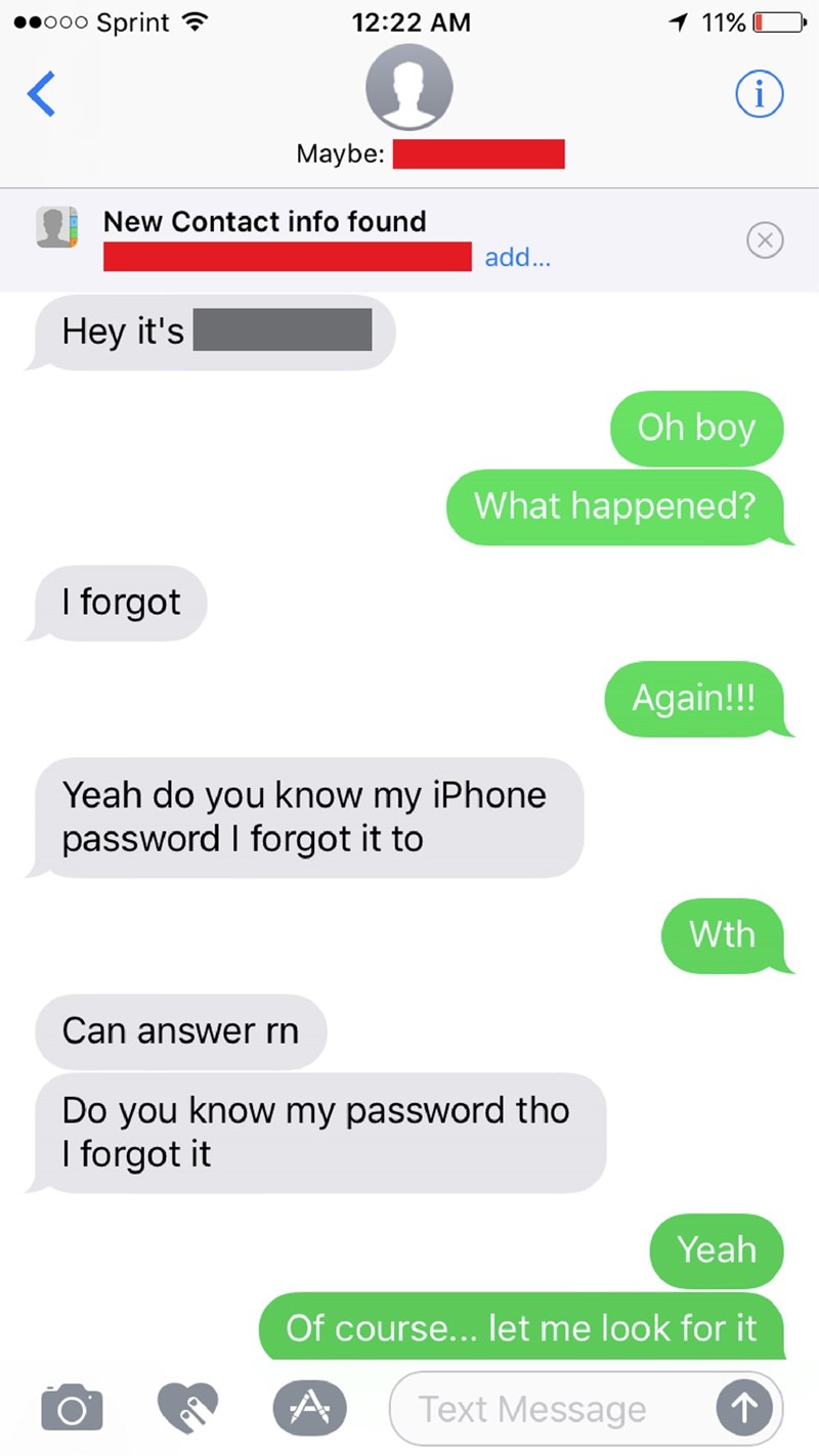 My little sister who is going to be a senior worked hard all summer to buy an iPhone, only to have it stolen (or fall out, she is still not entirely sure) out of her boyfriends car a week ago. She had not activated the find my iphone app so we reported it stolen but were pretty sure someone was just being gifted a free iphone courtesy of my sister's summer wages. On top of that, she had also bought a wallet case and lost all her ID's and cards as well.So yesterday I get this text from a strange number. I give my sister a quick call to make sure it is not her and effectively realize someone is fishing through her contacts or documents to get her password.I am well aware after the WTH that his is not my sister BTW.