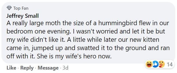 How in the world did you make a story about a kitten pouncing on a bug heartwarming? Now, we can only see this itty bitty kitty running full speed into the room with the Superman theme song playing in a background, cape flapping behind it, capturing this moth mid-air and saving this person's wife. We're obsessed.
