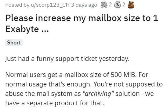 Ever heard of an exabyte? Yeah, we haven't either. Turns out an exabyte is one billion gigabytes, and while it would be nice to have such a large amount of personal cloud storage capabilities, it's probably several hundred million gigabytes larger than any one individual could ever possibly fill up with their computer. The user who requested that this tech support employee increase her email storage claimed she constantly runs out of space and wouldn't take no for anything beyond one exabyte. Again: this is one billion gigabytes. Anyone with technological literacy should recognize that this type of storage costs thousands of dollars, but we do not live in a world with a high computer literacy rate. This request is as if s as if a customer was screaming down your throat demanding you put a recliner in a paper bag. It just doesn't reflect a realistic need anyone has, nor does it make any real sense whatsoever. The original poster's manager found this request so ridiculous they wanted to frame the ticket and put it in their hall of fame.
