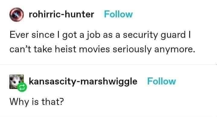 See the thing that heist movies fail to comprehend about security systems is that security teams aren't robots. Security teams are like any workplace, full of moronic inconsistency and barely followed protocols. This Tumblr users explains that a crack heist team might as well roll the dice on where a guard is supposed to be at any given time, or whether they'll even respond to any active alarms. For more from Tumblr, here are some random Tumblr gems.