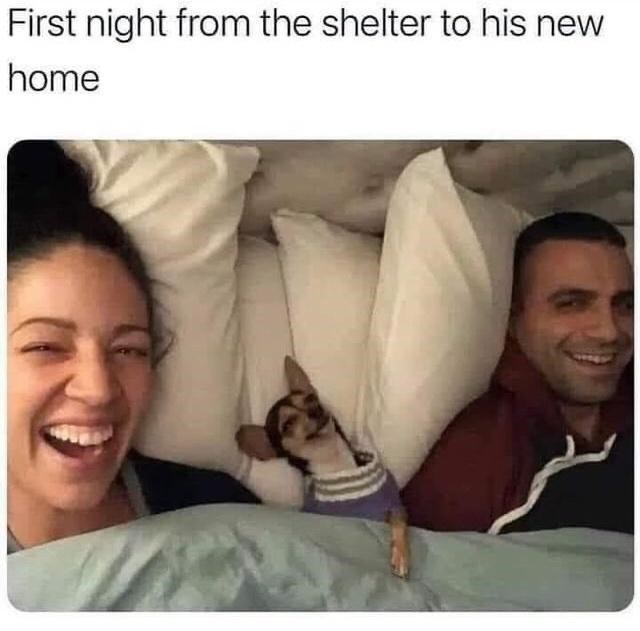 Happy dog, happy family! Imagine this doggo's happiness when this lovely couple waltzed into the shelter and swept him off of his paws! He looks totally blissed out. To many more nights that start like the one pictured here!
